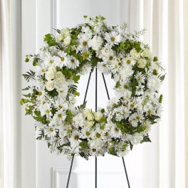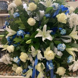 Price: $2,225.00 Monochromatic Casket Spray, Easel Wreath, Dual Vase Arrangements Product Tags: Same-day Delivery